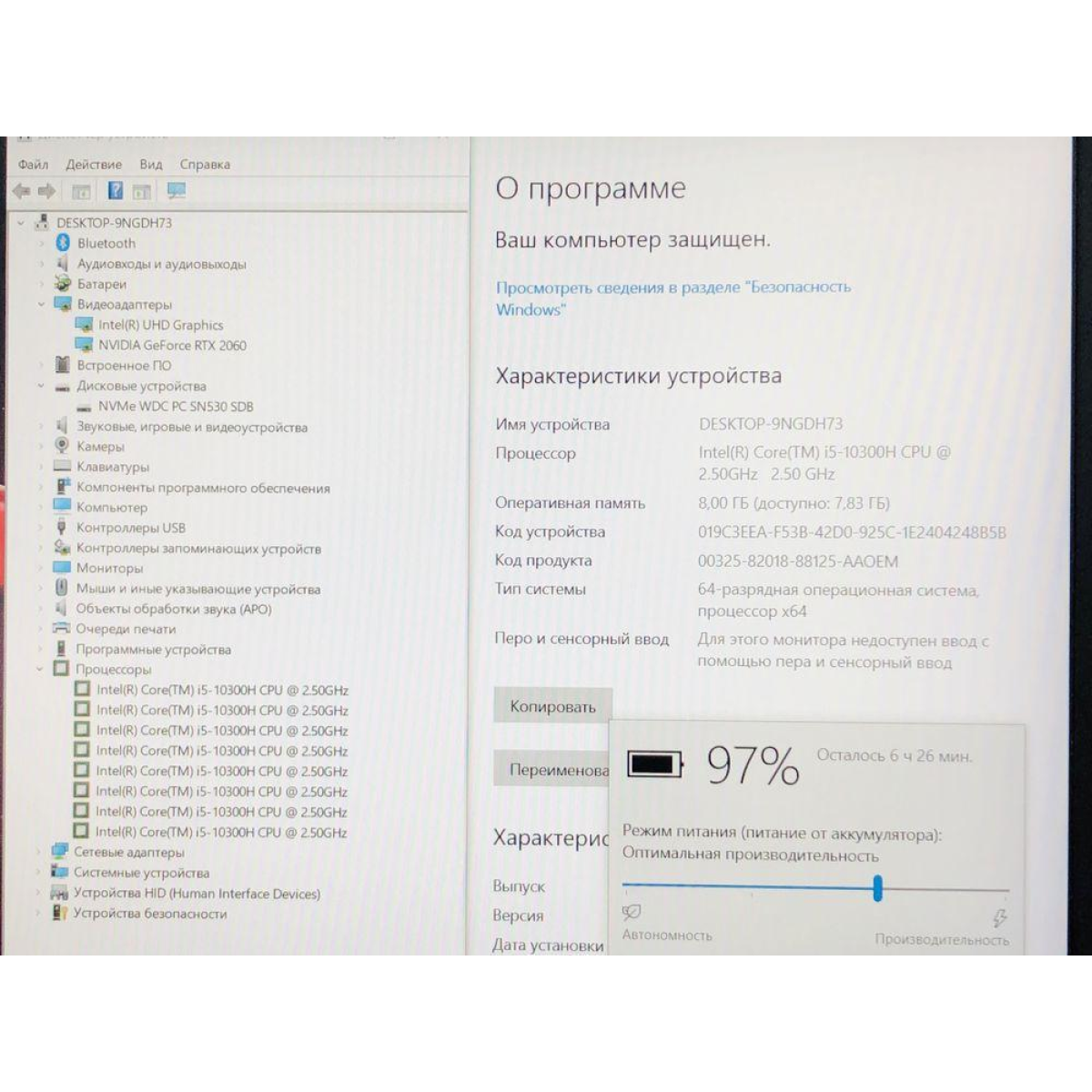 Оснащений 8 потоковим процесором Intel Core i5-10300H, і двома відеокартами: одна Intel UHD Graphics, а друга ігрова RTX 2060 6gb виділеної відеопам“яті, достатньої для відео ігор.