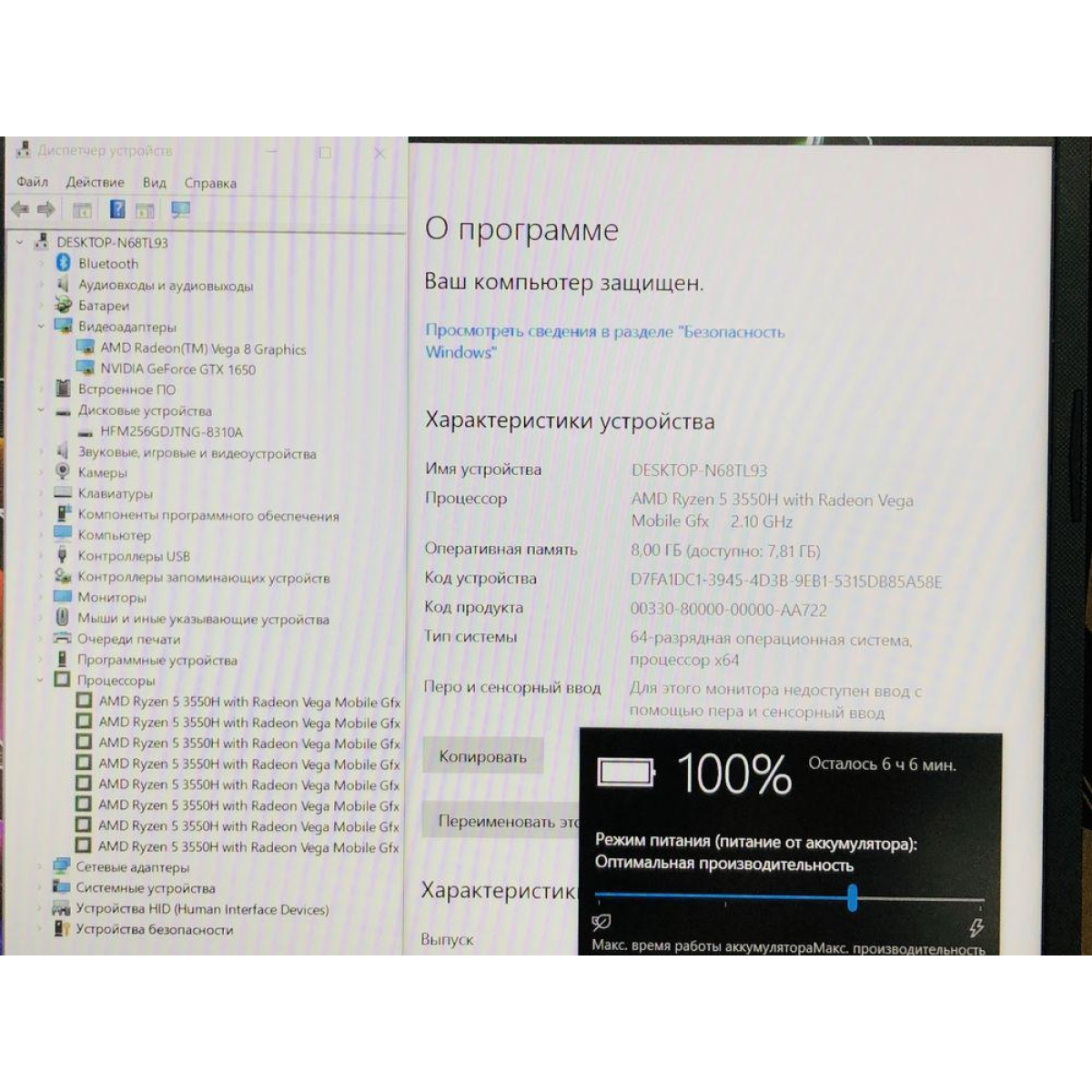 Оснащений 8 потоковим процесором AMD Ryzen™ 5 3550H і двома відеокартами: одна Intel UHD Graphics, а друга ігрова GTX1650 4Gb виділеної відеопам“яті, достатньої для відео ігор.