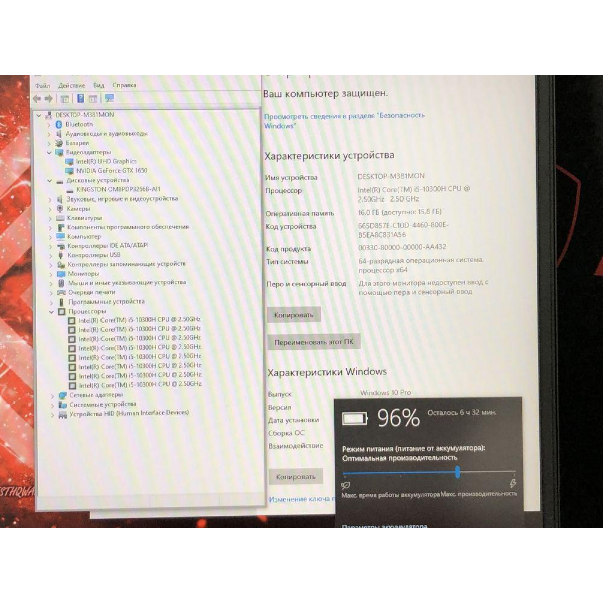 Оснащений 8 потоковим процесором Intel Core i5-10300H, і двома відеокартами: одна Intel UHD Graphics, а друга ігрова GTX1650Ti 4Gb виділеної відеопам“яті, достатньої для відео ігор.