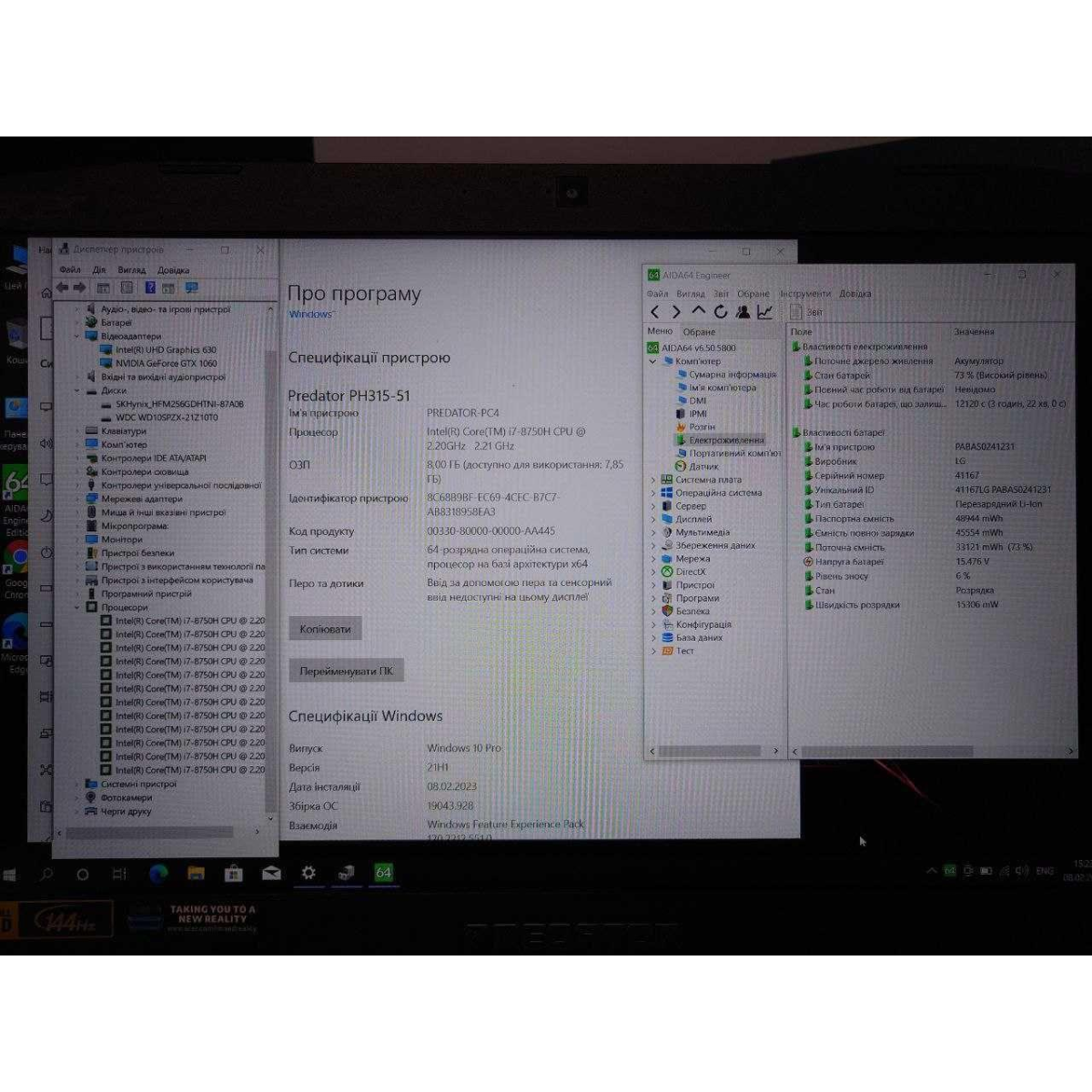Ноутбук Acer Predator - 144Hz/i7-8750H/8 Gb/SSD 256 Gb + HDD 1 TB/GTX 1060 6 GB