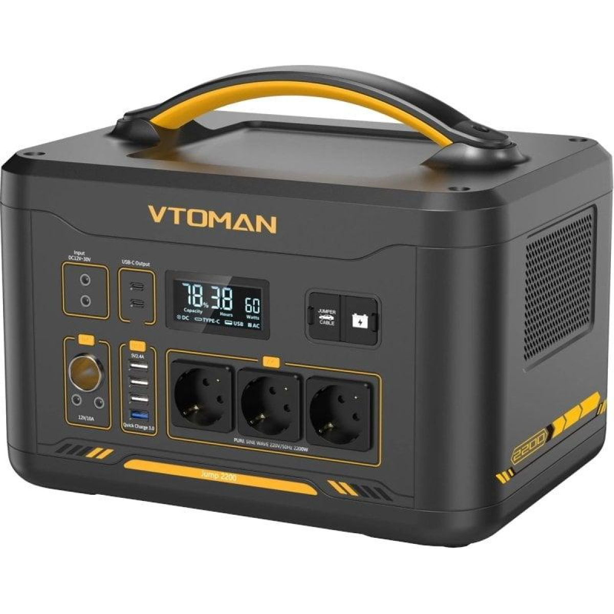 Портативний акумулятор VTOMAN Jump 2200 розрахований на роботу із чистою синусоїдальною потужністю 2200 Вт (імпульс 4400 Вт). Крім того, Jump 2200 також видає 2200 Вт постійної потужності під час роботи пристроїв потужністю понад 2200 Вт замість відключення живлення. Він пропонує вам альтернативне аварійне рішення при живленні пристроїв потужністю понад 2200 Вт, таких як водонагрівачі, обігрівачі, печі тощо.