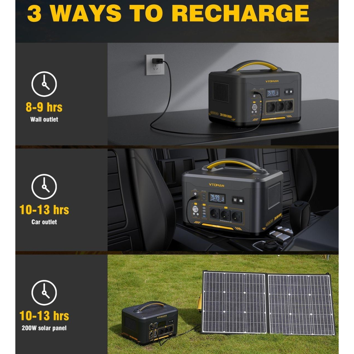 Портативна батарея VTOMAN Jump 2200 має 2 вхідні порти DC5521 (5,5 мм ? 2,1 мм), що підтримують максимальну вхідну потужність 200 Вт. Його можна повністю зарядити від настінного зарядного пристрою (входить до комплекту) о 7 годині, від автомобільної розетки 12 В (автомобільний зарядний пристрій входить до комплекту) о 12 годині або від сонячних панелей потужністю 200 Вт за 9-12 годин.